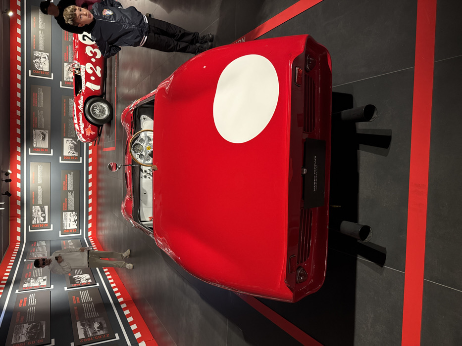 This image depicts an indoor museum exhibition at the Museo Ferrari in Maranello, Italy