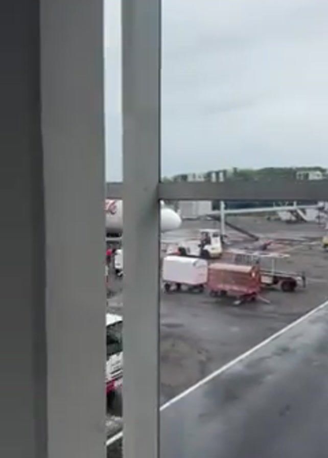 n exterior view of a Batik Air airplane from an airport gate. The camera pans along the gate walkway, showing the aircraft, ground support vehicles, and people walking toward the entrance. The weather is overcast, and the tarmac is wet. The gate area has white pillars and blue-tinted windows. A no-smoking sign is visible on the walkway floor.