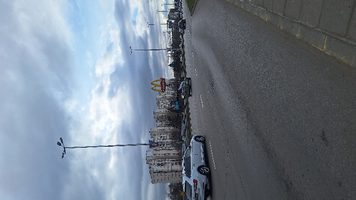 The image depicts an urban street scene in Sofia, Bulgaria, specifically looking southeast along Cherni Vrah Boulevard in the Lozenets district, near the intersection with Srebarna Street. The foreground features a concrete sidewalk on the right, bordered by a worn curb, and a wide, asphalt multi-lane roadway. The asphalt appears damp or reflective, with worn white dashed lane markings visible. In the left lane of the visible roadway, a white Skoda Superb Combi, identifiable by a "CA" Sofia license plate, is oriented away from the viewer. Further down the road, a dark green sedan and other distant vehicles are present, indicating traffic flow. A very tall, slender streetlamp with a four-light fixture at its apex extends upwards into the sky from the left side of the frame, with additional streetlamps lining the boulevard. The background features a prominent, large, golden McDonald's "M" logo sign situated above bare deciduous trees. To the left of the McDonald's sign, a cluster of multi-story, light-colored residential apartment buildings with numerous windows is visible. The sky is largely overcast with significant cloud cover, though patches of lighter blue sky are visible in the upper right quadrant. No individuals are discernibly present in the scene.