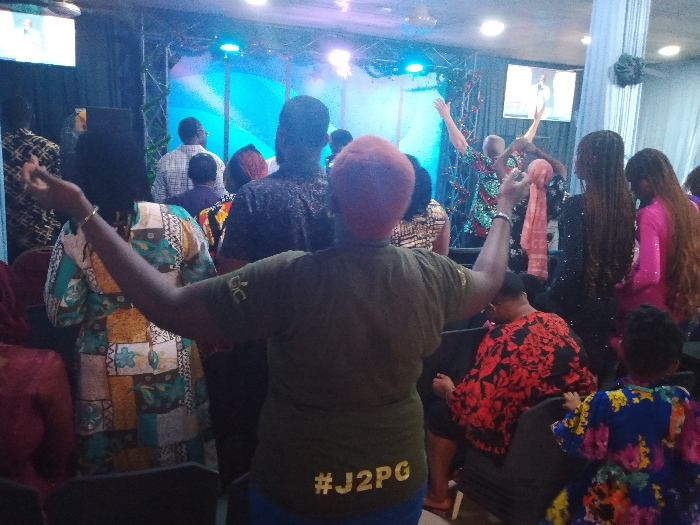 The image captures an indoor religious gathering within a venue located in Mgbuoshimini, Nigeria