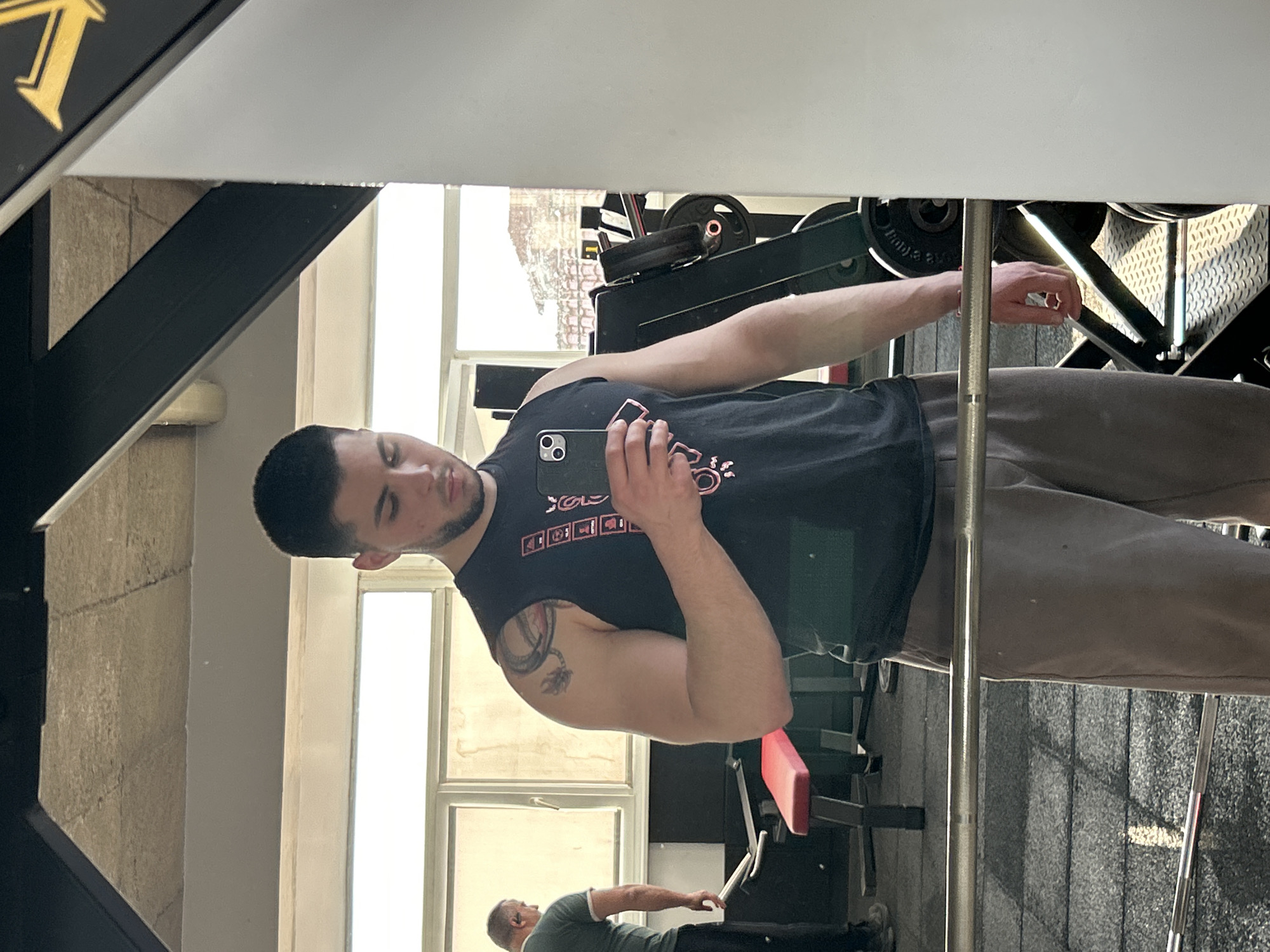 An indoor gym, located in Buhovo, Bulgaria, is depicted. A young adult male, appearing in a mirror reflection, stands centrally. He has short dark hair and stubble, wearing a black sleeveless t-shirt with faint graphics and light brown athletic trousers. A visible tattoo of a dragon or similar creature is on his left upper arm. He holds a black smartphone, featuring a dual-lens camera, with his right hand at chest level, viewing the screen. A red band is present on his right wrist. In the background to the left, a partially visible older male, with short grey hair and a visible earpiece, is observed from behind, wearing a green short-sleeved shirt and dark trousers, appearing to be moving or leaning. The gym floor is composed of dark, textured rubber matting. A silver barbell lies horizontally in the lower mid-foreground. A red and black weight bench is positioned behind the main subject to the left. To the right, various black weight plates are stacked on a piece of gym equipment, possibly a squat rack, situated on metallic diamond-plate flooring. Large windows across the background reveal an exterior scene of buildings with red roofs set against a hilly landscape. The interior walls are light-colored, and the ceiling is concrete with visible structural elements. A black panel with a gold emblem is partially visible on the far right. The scene is brightly lit by ambient light, casting shadows on the floor.