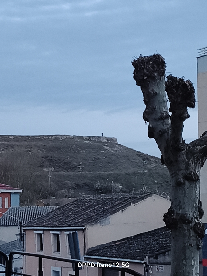 The image depicts a panoramic view of an urban area in Cuéllar, Spain, leading to a prominent natural hill under an overcast sky. In the immediate foreground on the right, a large, leafless, pollarded tree with a thick, gnarled grey-brown trunk and heavily pruned branches extends vertically from the bottom edge. A dark metal railing is partially visible along the bottom-left edge. The midground features residential buildings with dark, ridged tiled roofs. On the left, a building with an orange-red facade and a blue horizontal trim is partially visible. Centrally, another building with a light beige or pink facade exhibits several dark, rectangular window openings. Multiple pole-mounted antennas are discernible above the rooftops and on the lower slope of the distant hill. The background is dominated by a dark, undulating hill or escarpment characterized by sparse vegetation and rocky outcrops. A single, small, dark, silhouetted human figure stands upright atop the distant, flat crest of this hill, positioned slightly to the left of the hill's center and facing towards the right of the frame. The sky is a uniform, pale grey-blue, indicating overcast weather conditions. A digital watermark displaying "OPPO Reno12 5G" is present in white text at the bottom center of the image.