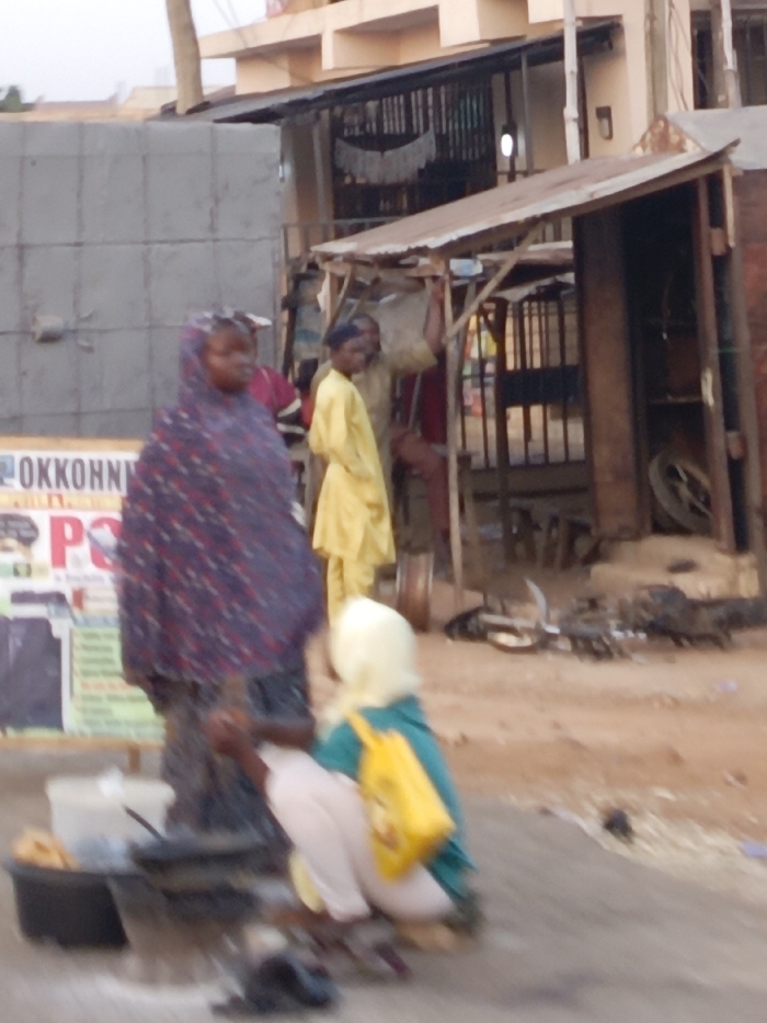 A street scene shows people, likely in West Africa, going about their daily lives. One woman wears a patterned headscarf and robe, while another, with a yellow headscarf and a green shirt, crouches near a cooking setup with a frying pan. In the background, two men stand near a stall constructed with corrugated metal. Debris, including a bicycle frame, litters the dusty ground. The building behind the stall appears to have laundry hanging from its upper level.