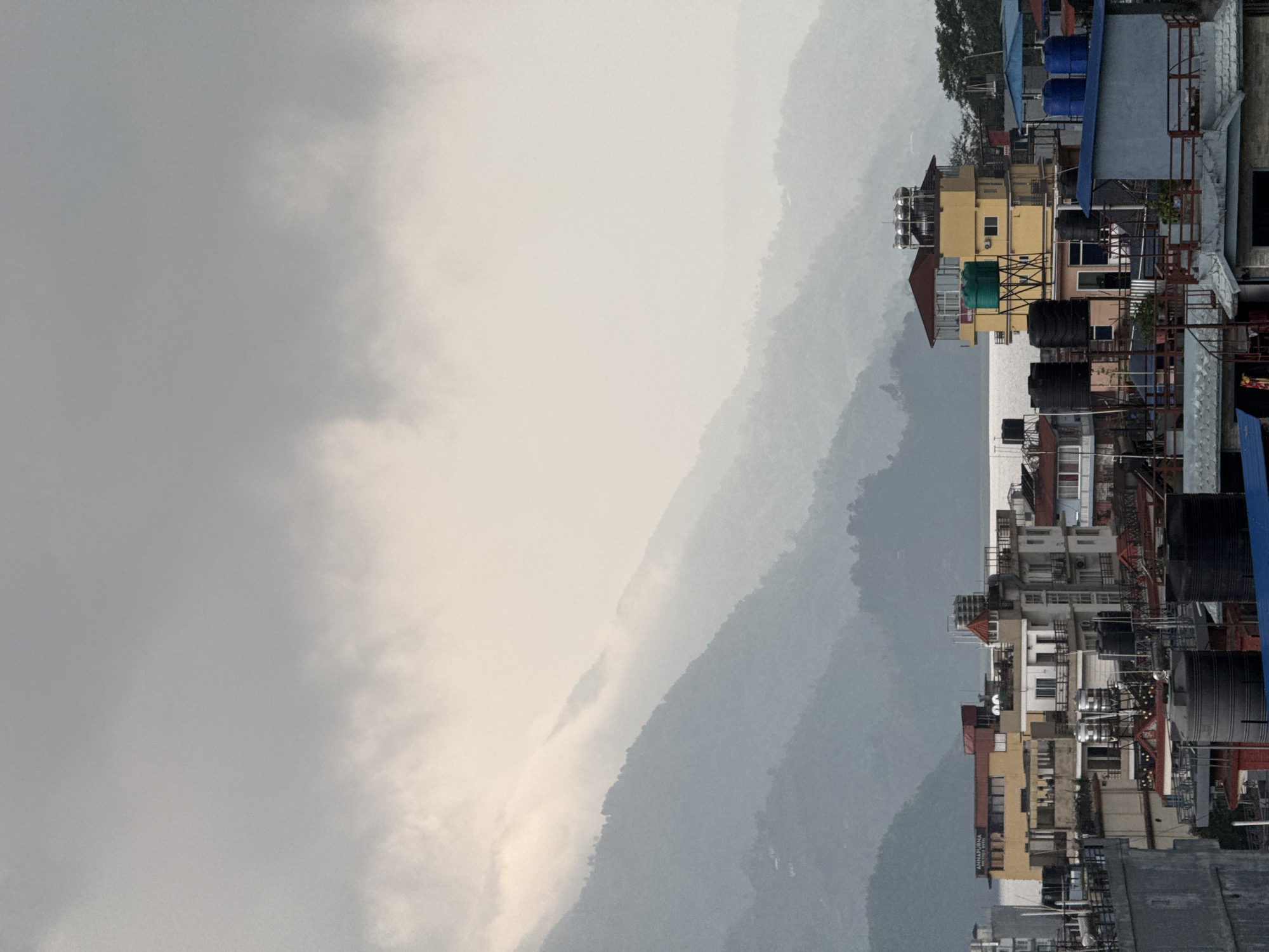 view in Pokhara, Nepal, featuring buildings on the right and a hazy mountain range on the left