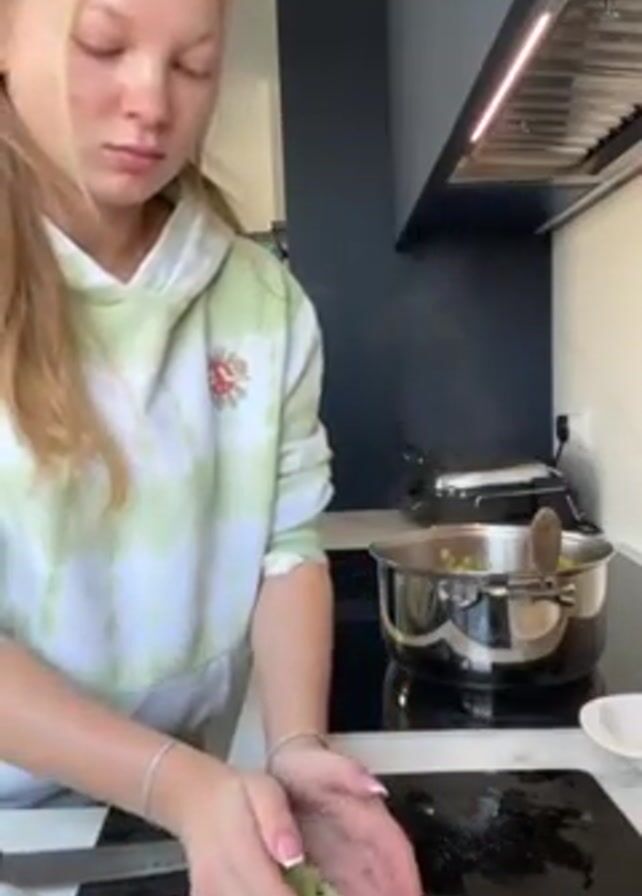 A young woman is cooking in a modern kitchen. She is standing at a white countertop, wearing a light green tie-dye hoodie and bracelets. She has light blonde hair and a serious expression. On the counter in front of her is a black cutting board with diced green vegetables. She scoops up the vegetables with her hands and adds them to a stainless steel pot on a black stovetop. Steam rises from the pot. Behind her is a dark gray wall and a stainless steel range hood. A small white bowl is on the counter to the right of the cutting board.