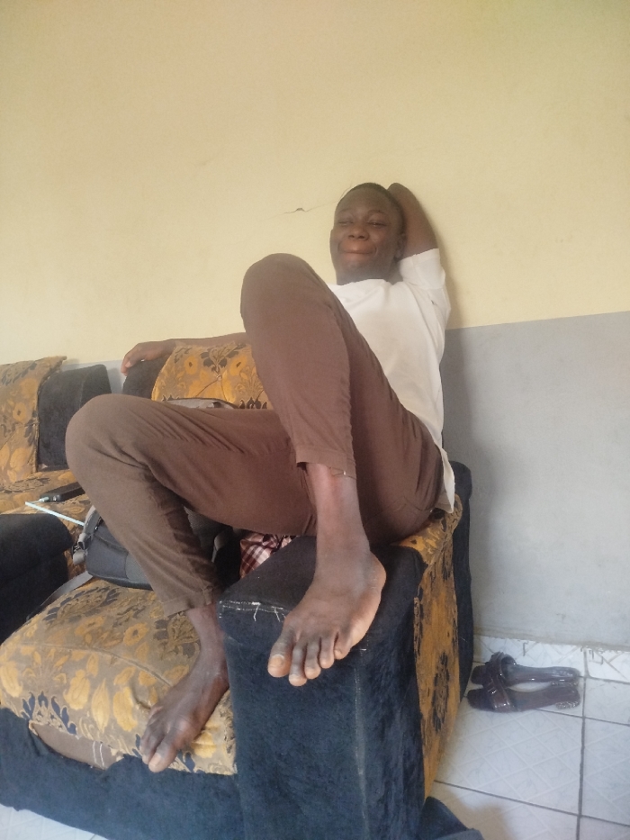 An adult male is depicted reclining on a multi-seat sofa within an indoor setting in the city of Masaka, Nigeria