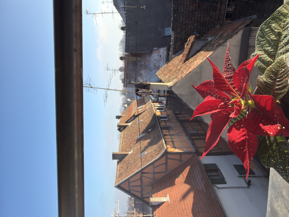 The image depicts an elevated view of rooftops and residential buildings in Bouxwiller, France, under a clear blue sky. In the foreground, a vibrant red poinsettia plant is positioned, its leaves dusted with small, white, glitter-like particles. The plant partially obscures the lower portion of the view. A dark, horizontal metal railing extends across the upper mid-ground, framing the scene. Beyond the railing, numerous buildings with terracotta-tiled pitched roofs are visible. Dominant structures include several half-timbered houses with light orange facades and dark brown wooden beams. Some roofs show scattered patches of white, possibly frost or light snow. Multiple television antennas are mounted on the rooftops, extending vertically against the sky. Various chimneys, windows, and dark green shutters are discernible on the buildings. The overall environment suggests a crisp, sunny day with long shadows cast across the roofs, indicating direct sunlight from a low angle. No individuals are visible.