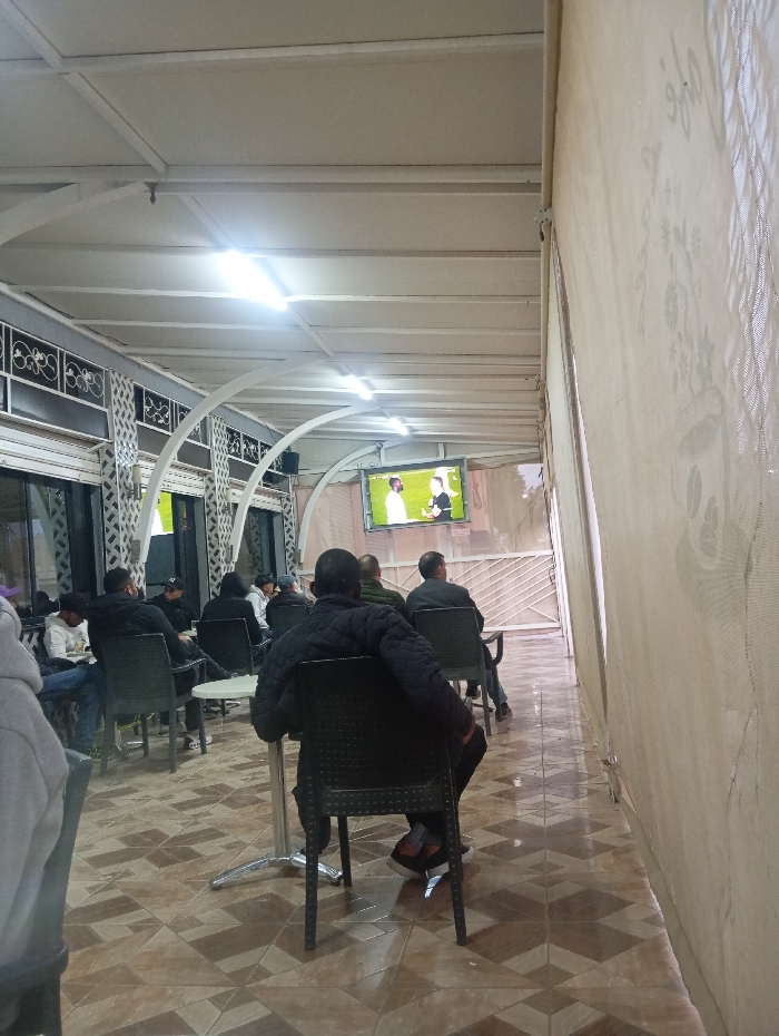 Several people are seated on black plastic chairs, facing a television mounted on a wall in an outdoor cafe. The TV shows a sporting event. Some of the people are at tables. The cafe has a white ceiling with lights, and decorative metal supports and a tiled floor with a geometric pattern. A partially visible, light-colored curtain hangs to the right. The scene suggests a casual setting where people gather to watch sports.