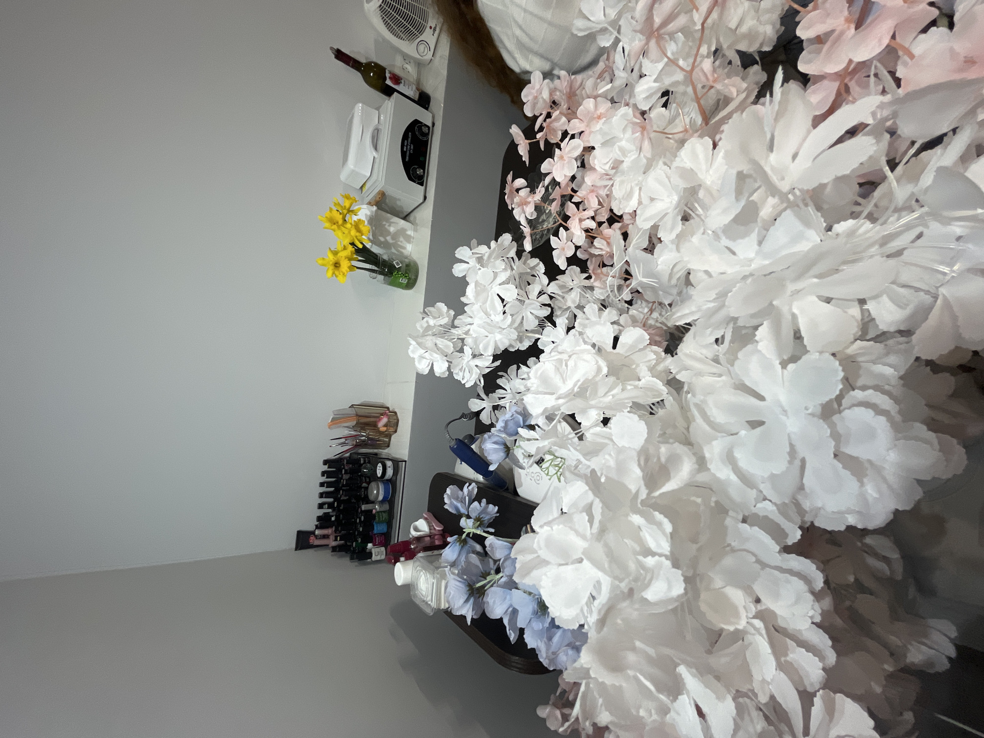 The scene is an indoor view within a room in Vagharshapat, Armenia, likely a salon or creative workspace. The foreground is dominated by a large arrangement of artificial flowers: primarily white, with sections of light blue and light pink interspersed. These flowers are situated on a dark brown surface, possibly a table or counter. On the left side of this dark surface, partially obscured by the flowers, are various nail care products and tools. These include an organizer holding numerous bottles of nail polish or gel (some visible labels include "UNO"), clear containers with brushes and nail files, smaller white and clear bottles, and a blue electric nail drill with its cord. Against the back wall, a white shelf extends across the width of the visible area. On this shelf, from left to right, are: a clear glass vase containing several yellow flowers (appearing to be daffodils), a small white rectangular container, a white electronic device with a display and control knobs labeled "TEMPERATURE STERILIZER" and "RTD-203," a dark-colored bottle with a red label (possibly wine), and a small white electric fan. The background consists of light grey walls forming an interior corner. On the far right, a portion of brown hair is visible, indicating the presence of a person whose body is mostly out of frame. The overall impression is a prepared setup for an activity combining floral decoration with personal care services.