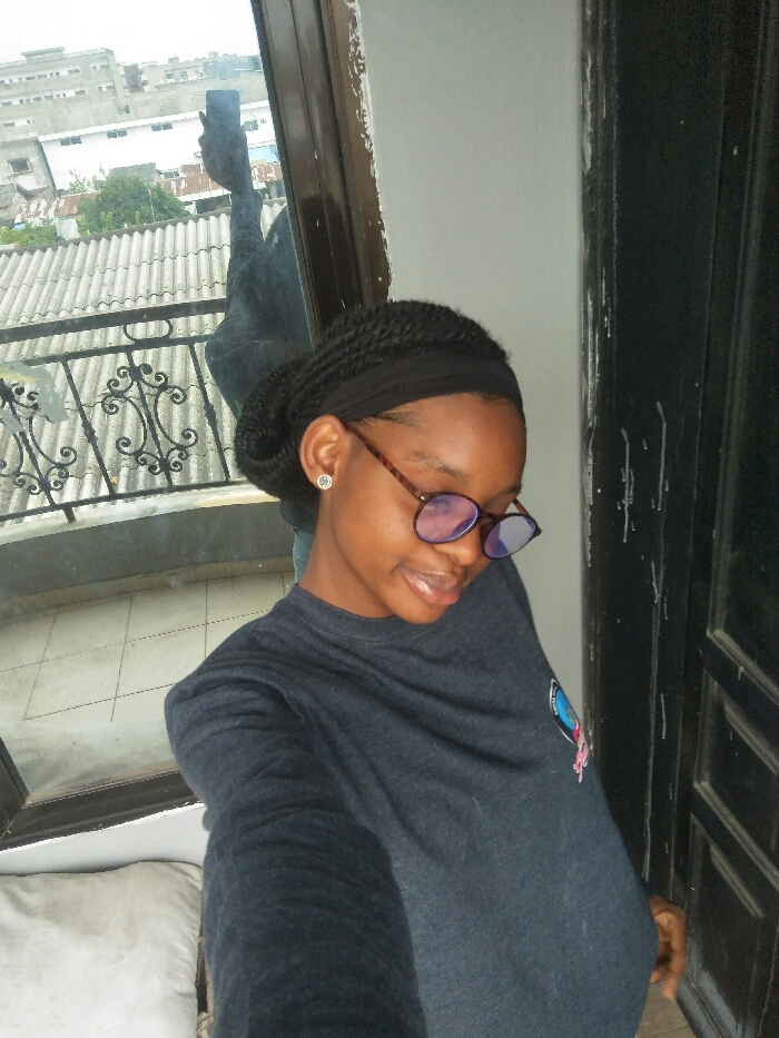 A young individual, appearing female, with dark skin and braided hair styled into an updo with a black headband, is centered in the image. She wears round, tortoise-shell framed glasses with blue-tinted lenses and a small, silver-colored stud earring in her visible left ear. She is dressed in a dark grey, long-sleeved t-shirt with a small, multi-colored emblem on the right chest. Her head is tilted slightly down and to her right, displaying a subtle smile. Her left arm, extended to hold a smartphone, is visible as a reflection in the glass panel to her upper left, indicating a selfie is being taken. The scene is an interior setting with an urban background, specifically identified as Cotonou, Benin. To the individual's left, a glass door or window offers a view of the cityscape. Directly outside this glass is a black metal balcony railing with ornate scrollwork. Beyond the railing, numerous structures with corrugated metal roofs are visible, interspersed with trees. Further in the distance, multi-story concrete buildings rise under a bright, overcast sky. To the individual's right, a dark wooden door or door frame is partially visible. A light grey wall separates the door from the glass panel. A white pillow or cushion is partially visible in the lower left corner of the frame.