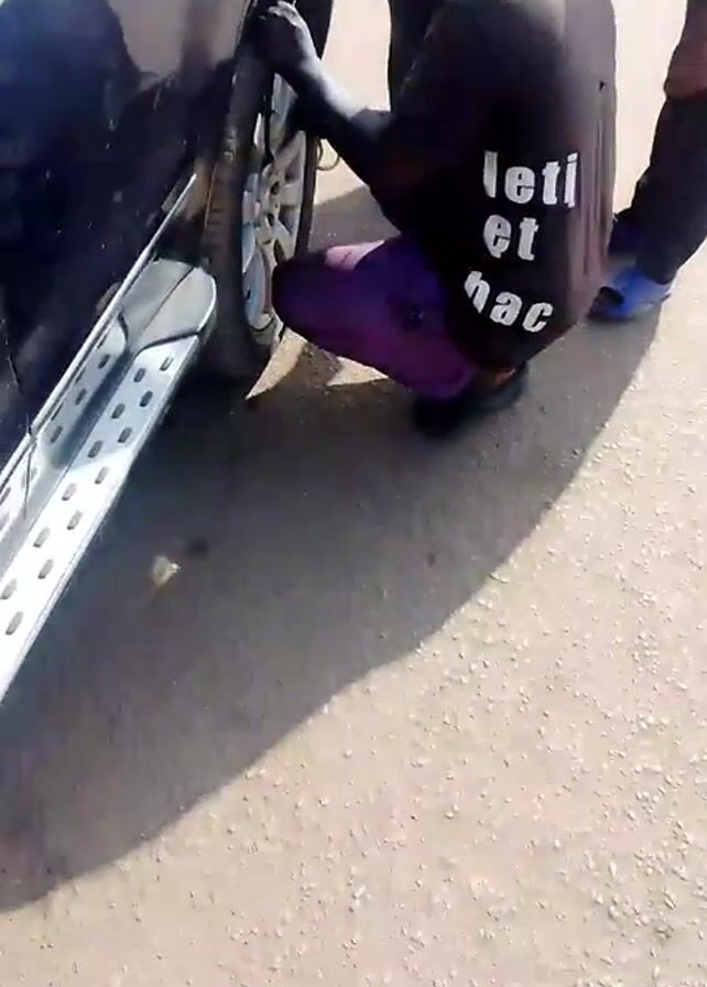 A video shows two men working on a black car. The first man, wearing purple pants and a black top, is kneeling and appears to be working on the car's rear tire with a tool. The car has a silver running board. The second man, wearing a striped hat and a black shirt, joins in the work on the tire. Another person in a gray shirt is seen standing near them. The environment appears to be an outdoor area with paved ground. The car is a dark color, possibly blue or black.