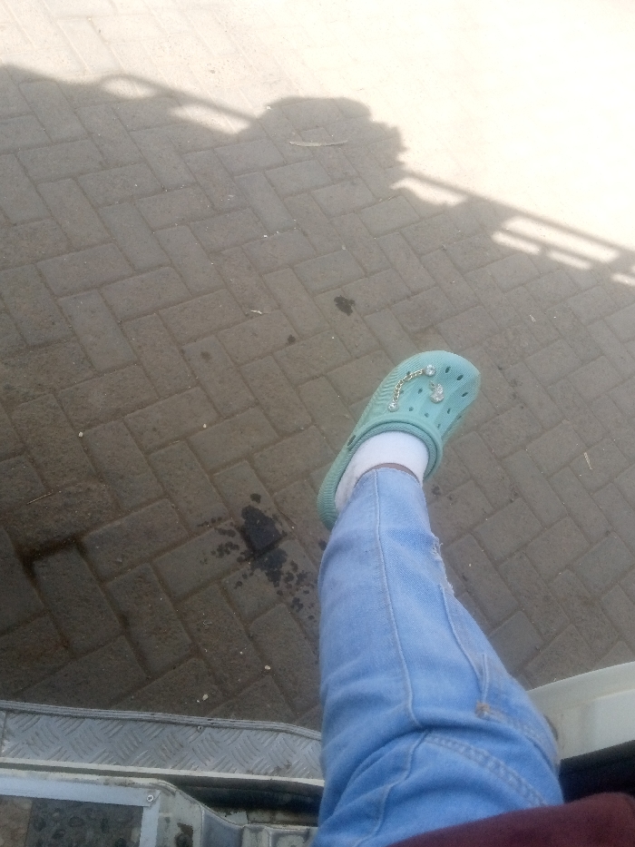The image depicts an elevated view of a person's lower right leg and foot in an outdoor setting within the city of Ol Kalou, Kenya. The individual is wearing light blue denim jeans, a white sock, and a light teal Croc-style shoe. The shoe is adorned with a silver-colored chain draped across the top and two clear, possibly rhinestone, charms inserted into the ventilation holes. The leg is extended, with the foot positioned over a paved surface constructed from grey rectangular interlocking pavers laid in a herringbone pattern. To the left of the foot, on the pavement, a prominent dark, irregular liquid stain, consistent with oil or grease, is present. A smaller, similar stain is visible further to the left. In the lower left quadrant of the frame, a portion of a metallic, diamond-plate surface, likely part of a vehicle step or utilitarian structure, is visible. Strong sunlight is indicated by distinct shadows cast across the paved area, including a large, diffuse shadow, possibly from foliage or an overhead structure, occupying the upper and central portions of the ground. No other individuals are visible. The action is stationary, with the leg extended.