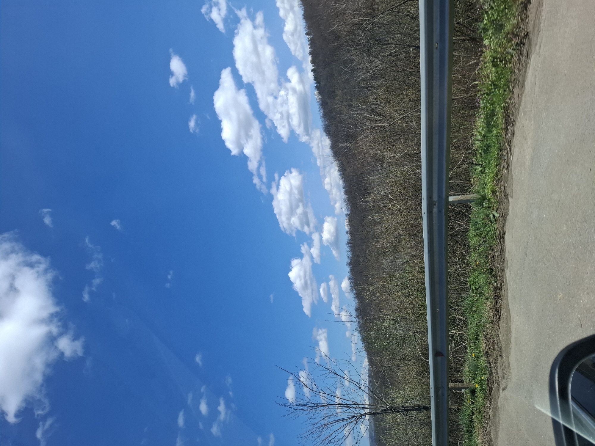 scene from a moving vehicle, likely a car. The view is through the side window, showing a bright blue sky with scattered cumulus clouds. A tree with bare branches is visible in the lower right. A dense forest with leafless trees lines the edge of the sky. A gray guardrail runs along the side of the road, separating the forest from a narrow strip of green vegetation next to the asphalt road. Part of the car's side mirror is visible in the bottom right corner. The location, identified as Blagovo, Bulgaria, would be in the outskirts. The time of year appears to be spring, as evidenced by the vegetation growth.