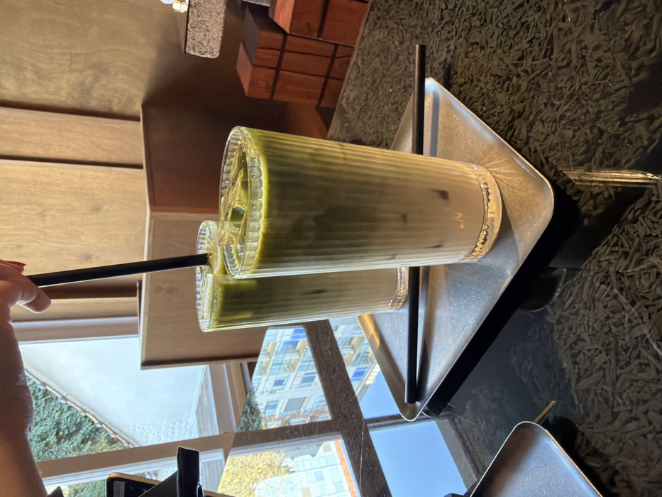 - "The image displays a close-up, slightly elevated perspective of two tall, vertically ribbed glass tumblers containing layered iced matcha lattes" by FM-xygyB2, licensed under CC BY 4.0