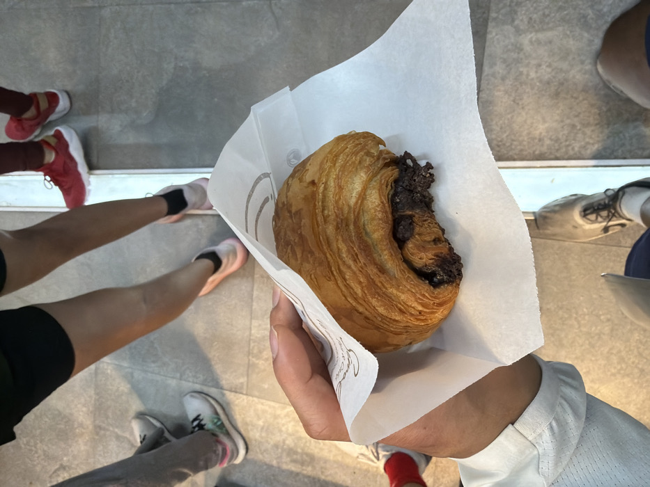 An overhead shot depicts a person's hand holding a chocolate croissant (pain au chocolat) wrapped in white paper, which bears the faint branding "Santana Pan & Café"