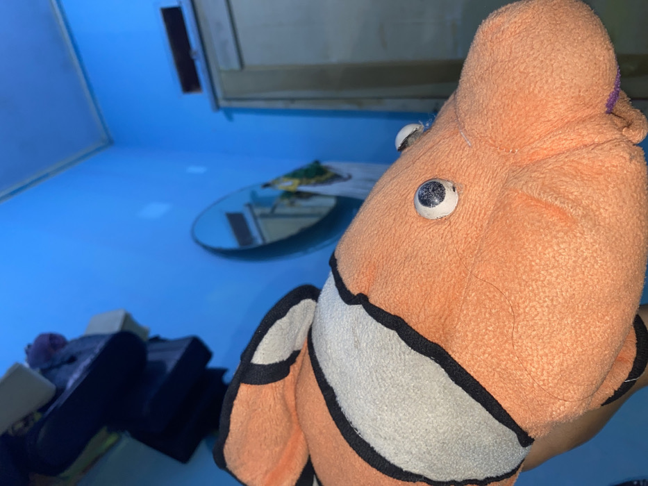 A close-up, angled view features a large, orange and white clownfish-themed plush toy in the foreground, facing right
