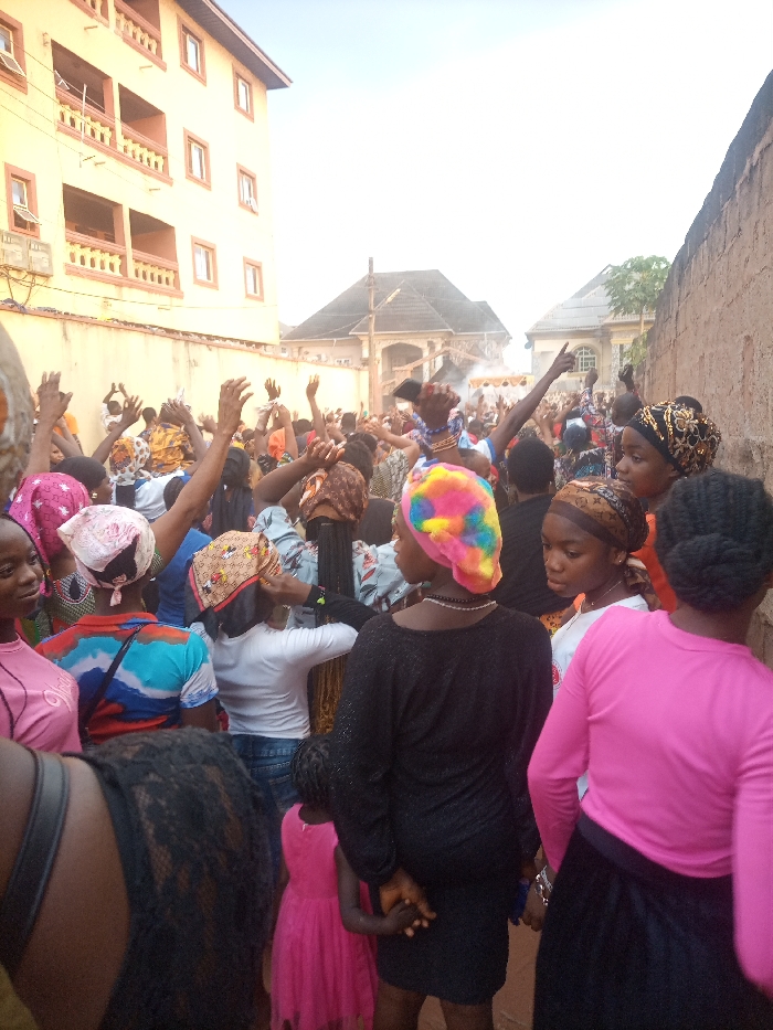 A crowd of people, mostly women, fills a street between buildings and a wall. Many raise their hands in the air. Some wear head coverings, including a colorful tie-dye. A small girl in a pink dress stands near a woman in a black dress. Smoke is visible in the distance. The crowd's focus is unclear, but their raised hands suggest celebration or worship.