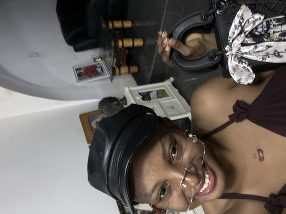 A woman smiles at the camera, wearing a black cap, thin-framed glasses, and a maroon top with bow details. She holds a black handbag with a patterned scarf tied to the handle. The background features furniture including a black leather chair, a glass-topped table with wooden details, a white cabinet, and framed pictures on the wall.
