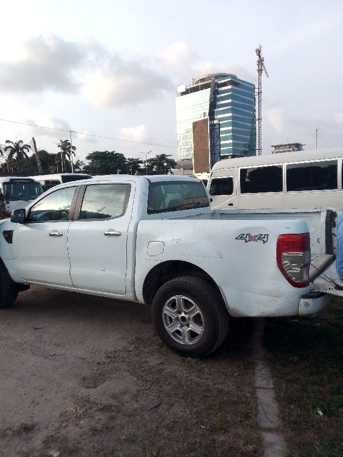 The image depicts a white Ford Ranger 4x4 pickup truck parked on a dirt and gravel surface with sparse grass, observed from its left rear quarter. The truck's tailgate is lowered, revealing some connected wiring. In the background, a large, modern glass-fronted building, featuring blue-tinted windows and a prominent brown vertical panel, is under construction with a tower crane positioned beside it. This building is identified as being in the Falomo area of Lagos, Nigeria. To the right of the pickup, a white passenger van or minibus is visible, and other white vans are partially obscured on the left. Palm trees and additional green foliage are present on the left side of the background. A single person, dressed in blue pants, is partially visible on the far right, near the open tailgate of the pickup truck. The sky is overcast.