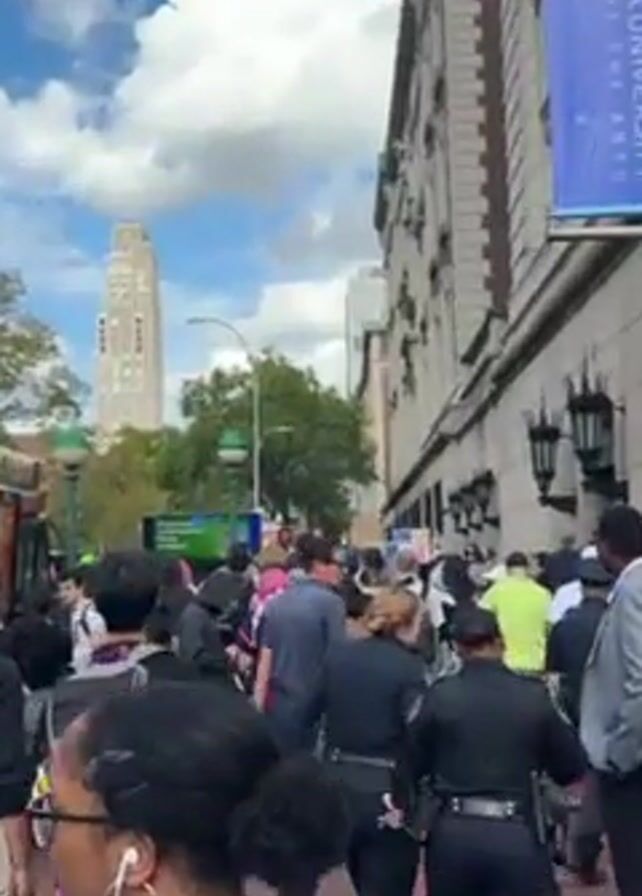 The video depicts a crowd of people gathered on a city street. The crowd appears to be a mix of students, police officers, and other individuals. Some people are carrying signs, which suggests a protest or demonstration is taking place. The scene is set against a backdrop of buildings, including Miller Theater and Columbia University School of the Arts. The weather appears to be sunny with some clouds in the sky. The camera is positioned at ground level, moving along with the crowd.