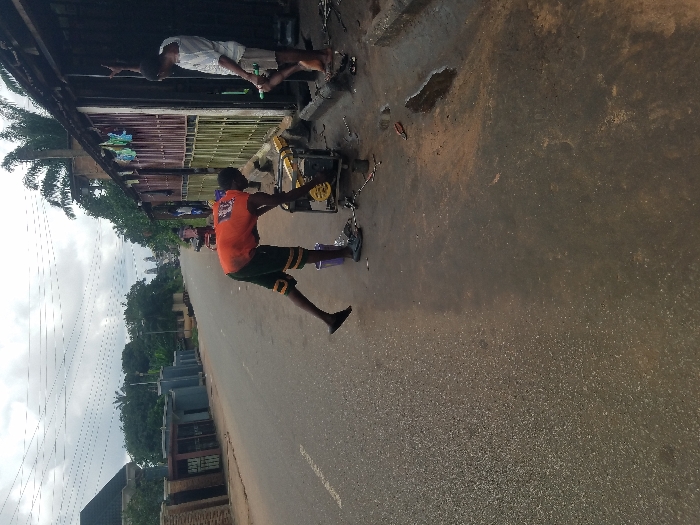 An outdoor scene depicts a roadside area in the city of Unknown, Unknown, under an overcast sky. A paved asphalt road occupies the left foreground and recedes into the distance. On the right, a narrow, unpaved dirt strip separates the road from a row of single-story, corrugated metal structures, likely workshops or informal shops, appearing weathered. Two males are present in the foreground on the right. A male, wearing an orange t-shirt, dark shorts with yellow stripes, and black sandals, is bent over a black and yellow portable generator on the dirt ground. He is actively engaged with the generator, possibly performing repairs, with tools scattered around the unit and a blue plastic bucket near his left foot. His right leg is slightly lifted, balancing on his left. Further right, a second male, barefoot and wearing a light-colored short-sleeved shirt and light shorts, stands within a darkened doorway of one of the structures. He faces left, holding a green object in his right hand, with his left arm raised and bent, appearing to grasp something above. Overhead, multiple utility lines traverse the frame. In the background, green foliage, including palm trees, is visible, and additional buildings line the far left side of the road. The dirt ground near the structures shows evidence of moisture or puddles.