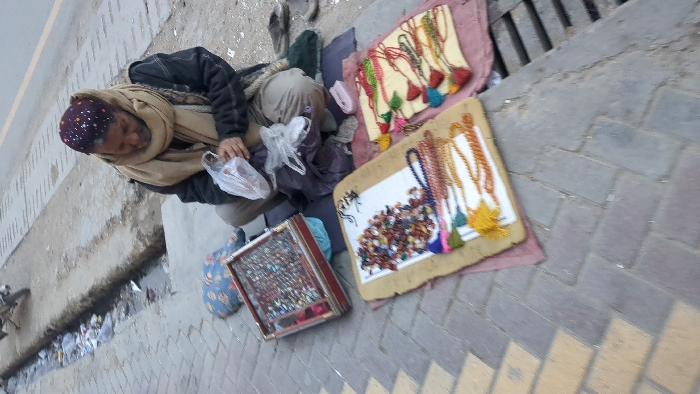 A male individual is observed seated on a sidewalk in Quetta City Tehsil, Pakistan. He wears a dark, patterned skullcap, a beige scarf wrapped around his head and neck, a dark jacket, and light-colored trousers. He is holding and looking down into a clear plastic bag. Another similar plastic bag rests near his lap. Adjacent to the individual are several items arranged for display. A red-framed wooden display case with a clear top contains numerous small, multi-colored rings. To its right, two flat, light-colored boards, placed on darker fabric, exhibit various beaded items. One board displays a cluster of irregular, polished, multi-colored stones and several beaded strands with tassels. The adjacent board holds multiple strands of beads, some also featuring colorful tassels. A dark blue patterned cushion is visible near the display case, and a pair of dark sandals or shoes rests on the unpaved ground adjacent to the sidewalk. A small pink plastic item is also on the ground near the individual's right leg. The immediate environment includes a paved sidewalk constructed from alternating grey and beige rectangular pavers set in a herringbone pattern. A concrete drainage channel, partially filled with debris, runs alongside the sidewalk, separating it from an asphalt roadway. A portion of a motorcycle is visible in the distant background beyond the roadway.