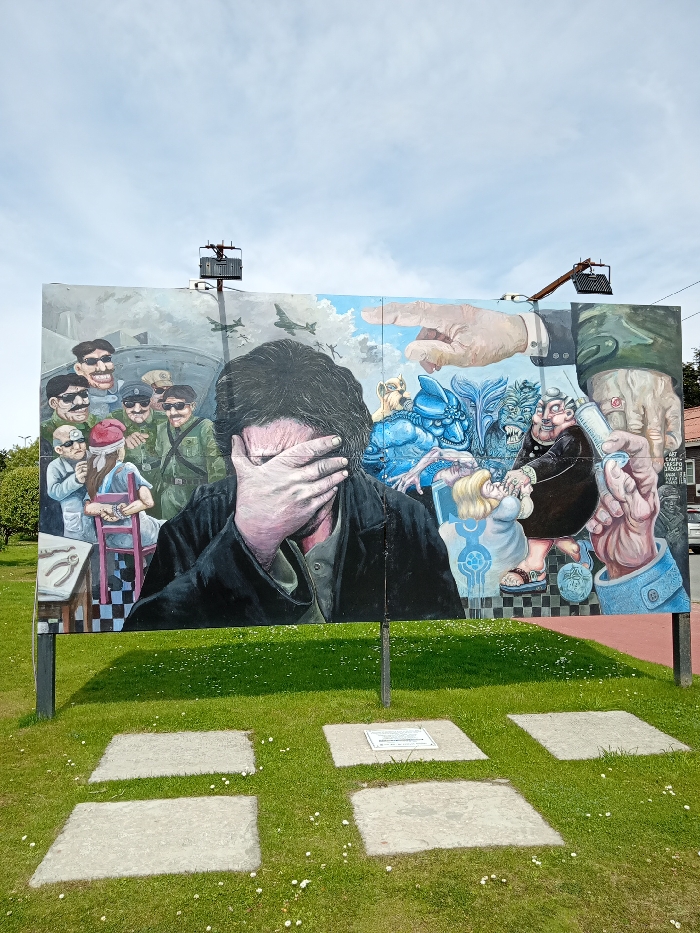 A large mural depicts scenes of suffering and oppression. A man with his face obscured by his hand takes center stage. Behind him, depictions include military figures, medical procedures, and monstrous creatures. An oversized hand points towards the chaotic imagery. The mural is displayed on a freestanding structure in a grassy area with concrete tiles. Lighting equipment is positioned above the mural.