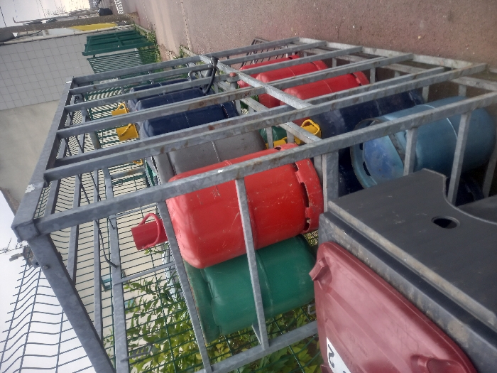 The image depicts a multi-tiered metal cage, likely galvanized steel, positioned on a reddish-brown paved sidewalk in Noyelles-sous-Lens, France. The cage contains numerous gas cylinders of various colors, including red, green, dark blue, light blue, and grey. A small red bucket and a yellow container are also visible within the cage. In the foreground to the left, a dark grey wheeled waste bin with a closed dark red lid, bearing a white number "2" sticker, is partially visible. The background features a green chain-link fence heavily overgrown with green foliage, behind which a light-colored building is present. Further to the right along the sidewalk, a dark green metal fence runs parallel to the paved path. The scene is observed under an overcast sky.