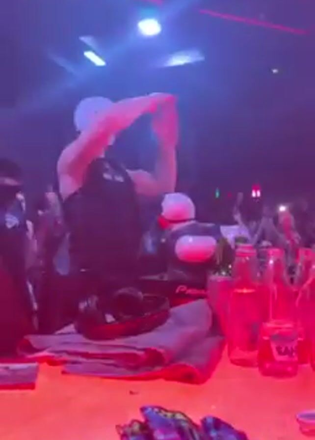 person in a white mask standing at a table, presumably a DJ booth, in a nightclub or similar venue. The lighting is predominantly red, creating a vibrant atmosphere. The individual in the mask is wearing a black tank top and has their arms raised in the air, appearing to be celebrating or hyping the crowd. In front of them on the table are several bottles and what looks like a mixing console. The background is slightly blurred, but it suggests a crowd of people, some of whom are holding up their phones, possibly recording or taking photos. The focus is on the masked person and the immediate area around the table.