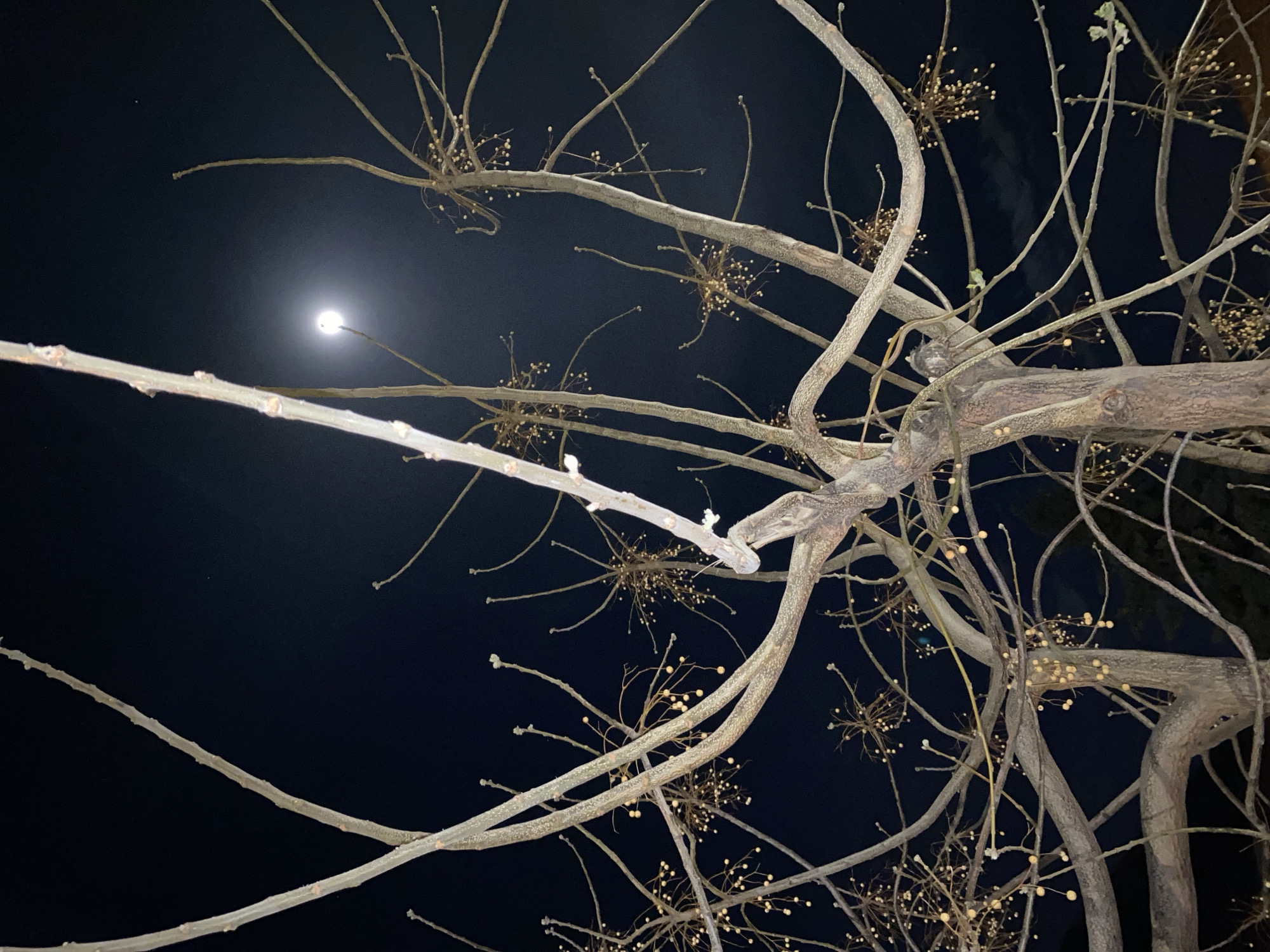 The image depicts a bare tree at night, its branches reaching up towards a bright moon