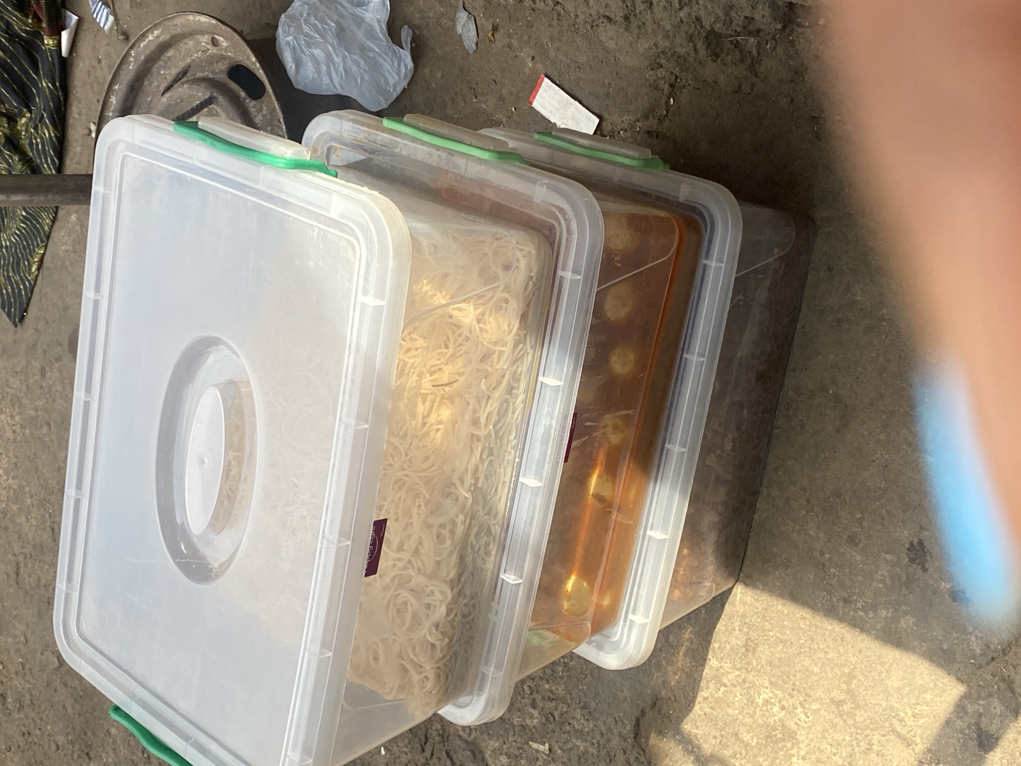 The image displays three clear plastic "Happy Life" food storage containers stacked vertically on an uneven ground surface in Ibadan, Nigeria
