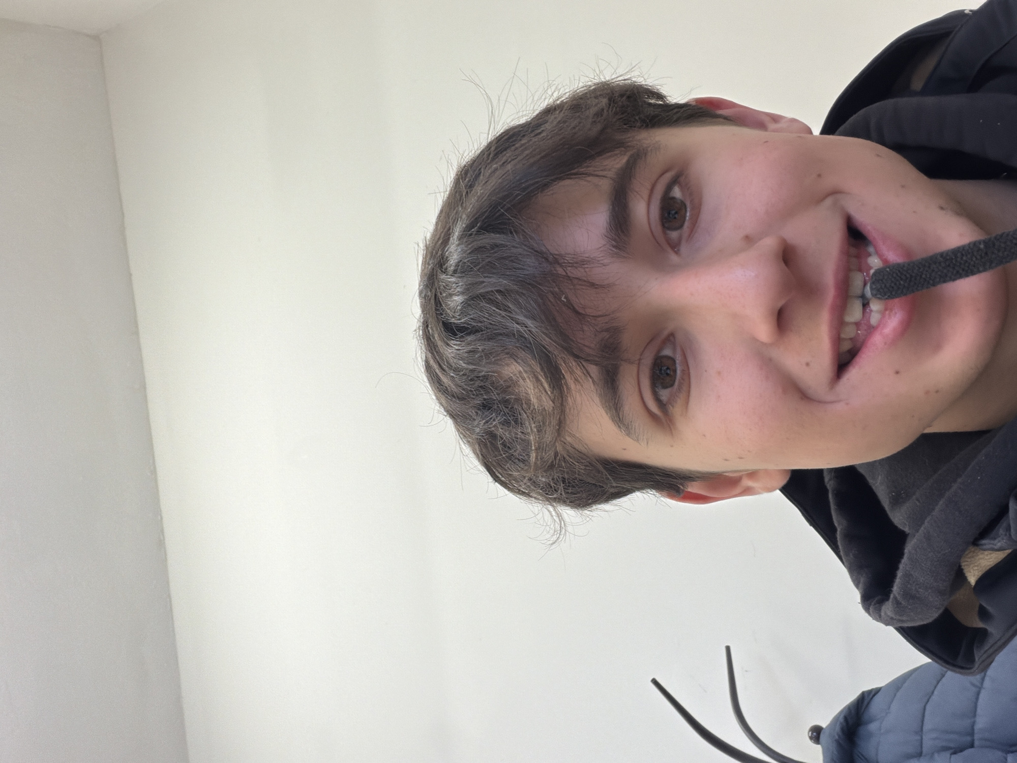 A young person with dark brown hair and brown eyes is facing the camera, smiling, and holding a black drawstring in their mouth