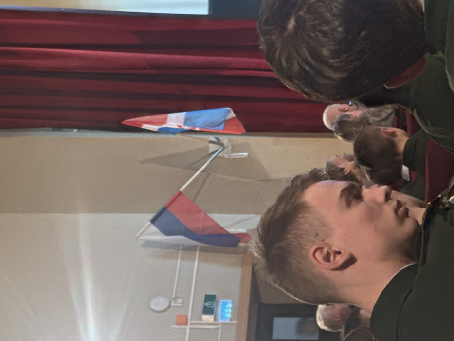 The scene depicts an indoor gathering in an auditorium or assembly hall in Markovskii, Russia. The perspective is from behind an audience, focusing on the heads and shoulders of attendees. In the left foreground, a young male with short, light brown hair, styled with faded sides, is visible in profile, looking downward and to the right. He wears a dark green uniform-style jacket with visible insignia on the lapel. To his right, the back of another individual's dark-haired head is partially visible. The background shows multiple seated individuals in dark red chairs, many wearing similar dark green attire, facing an unseen area. A light cream-colored wall behind the audience features two flags mounted on poles: the Russian national flag (white, blue, red horizontal stripes) and, to its right, a flag displaying red, blue, and white colors, consistent with the Serbian flag. Dark red curtains hang prominently on the right side of the frame. A circular white light fixture and a green exit sign with a white figure and arrow are visible on the upper left wall.