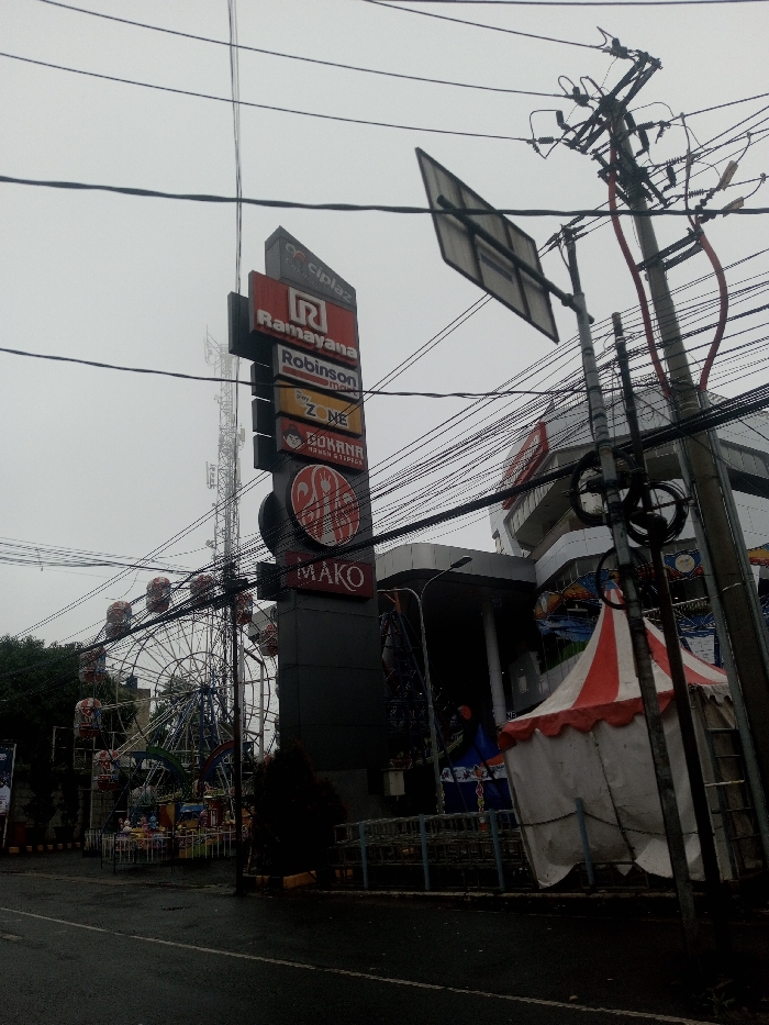 A commercial building boasts a tall sign listing multiple businesses: "Cipiaz," "Ramayana," "Robinson Mart," "Fun Zone," "Gokana Ramen & Teppan," and "Mako