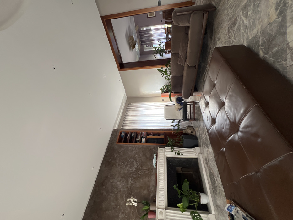 This image displays the interior of a residential living room located in Milan, Italy. The scene is captured from a low, wide-angle perspective, focusing on the room's furnishings and architectural details. In the immediate foreground, a large, rectangular brown leather tufted ottoman serves as a coffee table. The floor throughout the visible area is covered in polished grey marble or stone tiles with prominent darker veining. To the left, a white marble fireplace with fluted columns and a black firebox insert is central to the wall. A small, light blue classic car model and a white orchid plant in a terracotta pot are placed on the mantel. A green potted plant, identified as a Monstera, sits on the fireplace hearth. The wall above the fireplace features a textured, dark brown finish. Adjacent to this, a tall, narrow built-in wooden bookshelf filled with books and various objects is visible. Further into the room, a large window is obscured by long, vertically pleated light-colored curtains on the left. In the mid-ground, a dark wooden armchair is draped with a cream-colored blanket. A long, brown upholstered sofa with multiple cushions is positioned towards the center-right. Several green potted plants are distributed throughout the room, including near the window and behind the sofa. On the right side of the image, a wide, wooden-framed archway leads into an adjacent room, revealing what appears to be a dining area. Through this archway, a dining table with chairs, additional potted plants, and walls with a light purple tint are visible. The ceiling in this adjacent room exhibits notable damage, with a section of plaster or drywall having detached or collapsed, exposing underlying material. The ceiling of the main living room is white and flat, equipped with recessed spotlights. No individuals or animals are present in the scene.