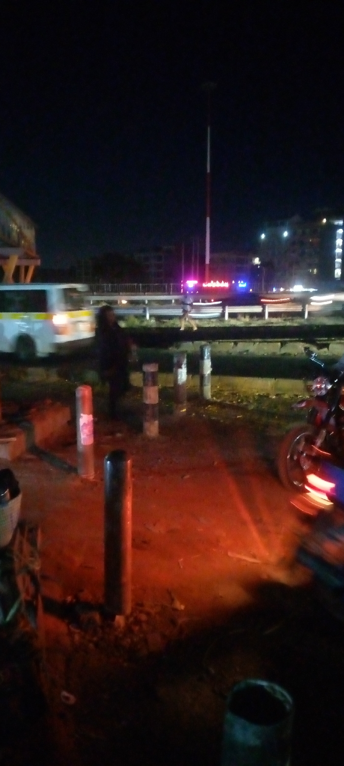 A nighttime scene features a roadside view with several bollards, a passing white vehicle on an elevated road, and a motorcycle parked on the right. Two figures are discernible in the background, possibly crossing the road. A tall pole with red and white markings rises in the distance, adjacent to a building illuminated with various colored lights. The foreground is dimly lit, with an orange hue emanating from an unknown source, likely reflecting off the ground.