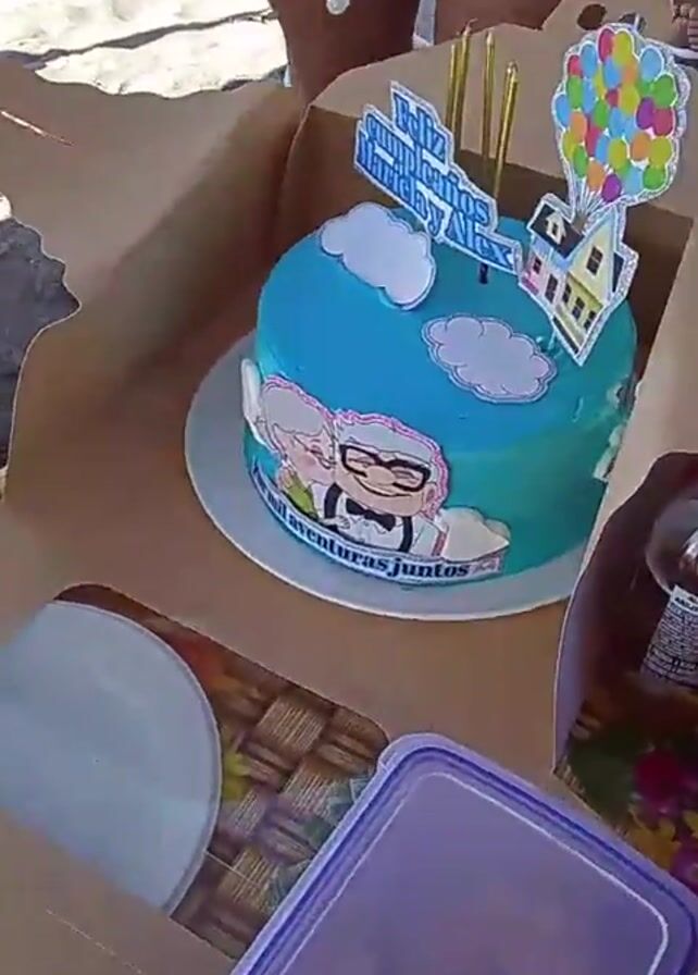 A person is recording a birthday cake. The cake is in a cardboard box on the beach. The cake is round, with blue frosting and cartoon decorations depicting the movie "Up". A white cake plate is beneath the cake. The decorations include a house with balloons, and a couple. The cake has the inscription "Feliz Cumpleanos Marilay y Alex" written on it. There are three lit candles on top of the cake. To the side of the cake are bottles and other items on the ground, possibly food and drinks for the birthday party. The camera's point of view is near the sand, looking up. A woman in white shorts is standing next to the cake. She is holding a clear plastic cup with a red straw. The beach setting is seen in the background, with sand and a few other people visible. The wind is blowing.