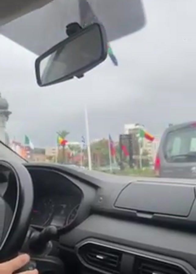 The video, shot from the interior of a vehicle, shows a person's hands on the steering wheel as the car is either stationary or moving slowly forward. Through the windshield, a street lined with various international flags is visible, flapping in the breeze. The sky is overcast, and there appear to be raindrops on the windshield. A fountain and some buildings can be seen in the background. A grey Peugeot vehicle is slightly ahead in the right lane. The interior of the car appears to be a modern design with a black dashboard.