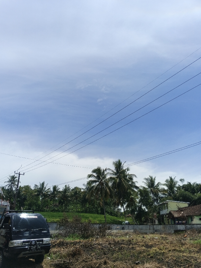 A sunny outdoor scene shows a black pickup truck parked on a patch of dry, grassy land. Behind the truck, a line of palm trees and other greenery stretches across the background, with rice fields visible. A modest house with a tiled roof is partially obscured by the foliage. Power lines run horizontally across the bright, blue sky.