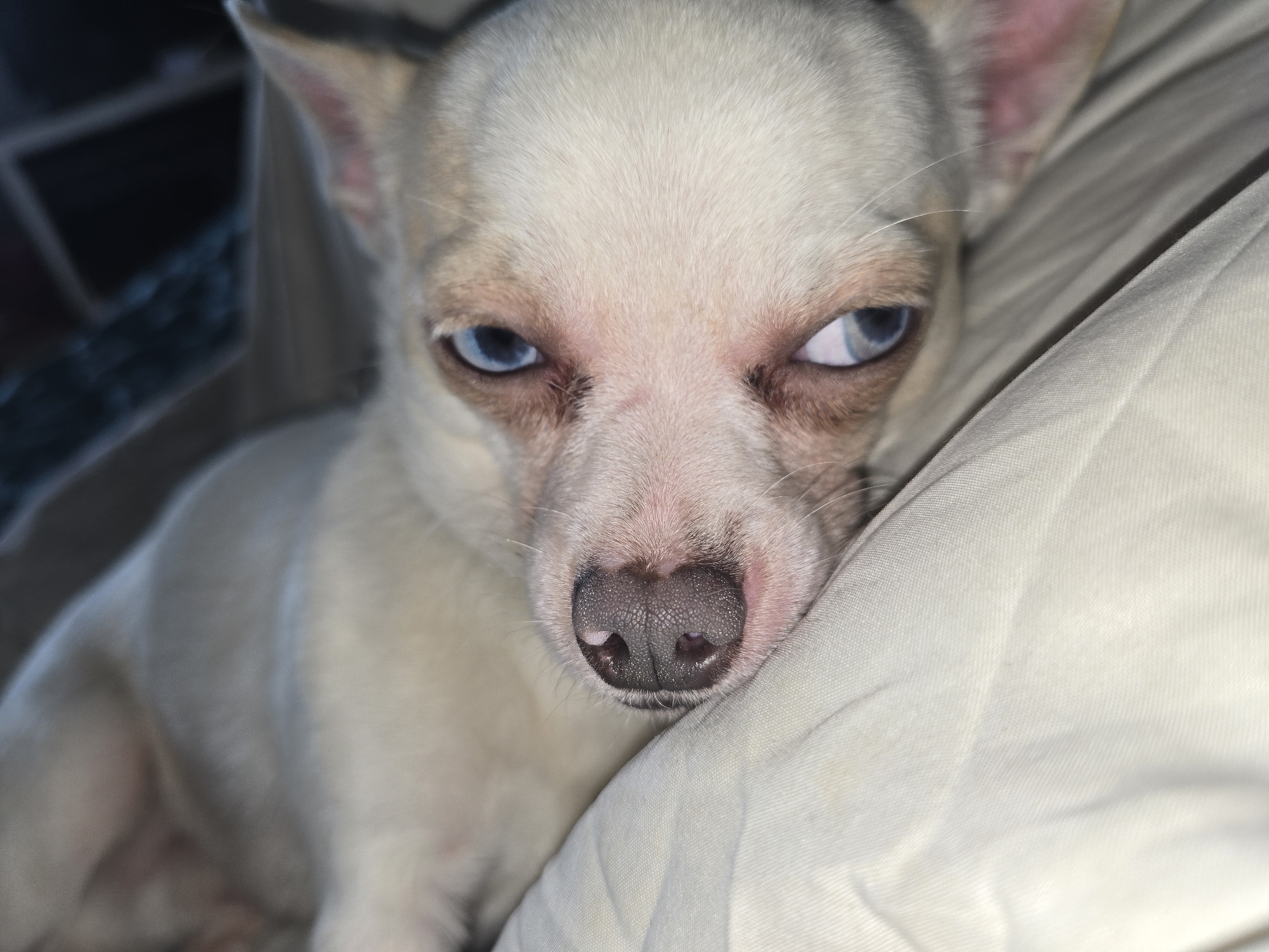 A close-up, eye-level photograph shows a small, cream-colored dog, consistent with a Chihuahua breed, positioned indoors. The dog features prominent bright blue eyes that are directed forward and slightly inward towards the viewer. Its dark, textured nose is visible at the center, with light-colored whiskers extending from its muzzle. One ear, showing a pink interior, is partially visible on the upper left. The dog is resting on a light beige or off-white fabric surface, which appears wrinkled and occupies the lower right portion of the frame. The background on the upper left is dark and out of focus, providing no discernable details beyond an obscured pattern. The precise location within the city of Hem, France, cannot be determined from the visual content of this image.