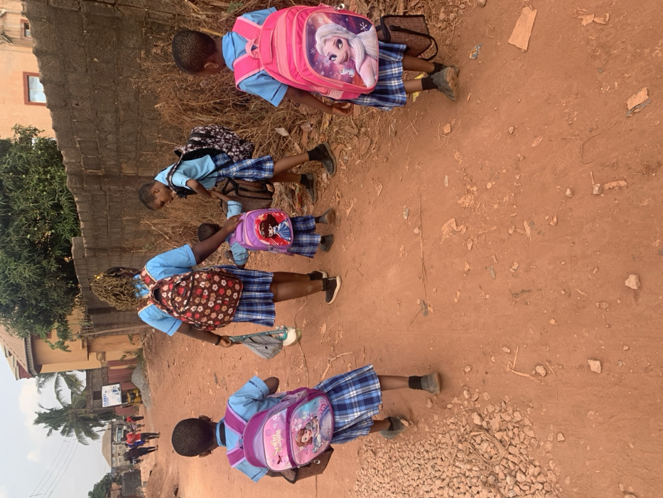 The image displays five individuals, four children and one young adult, walking away from the camera on an unpaved, reddish-brown dirt road in Enugu, Nigeria