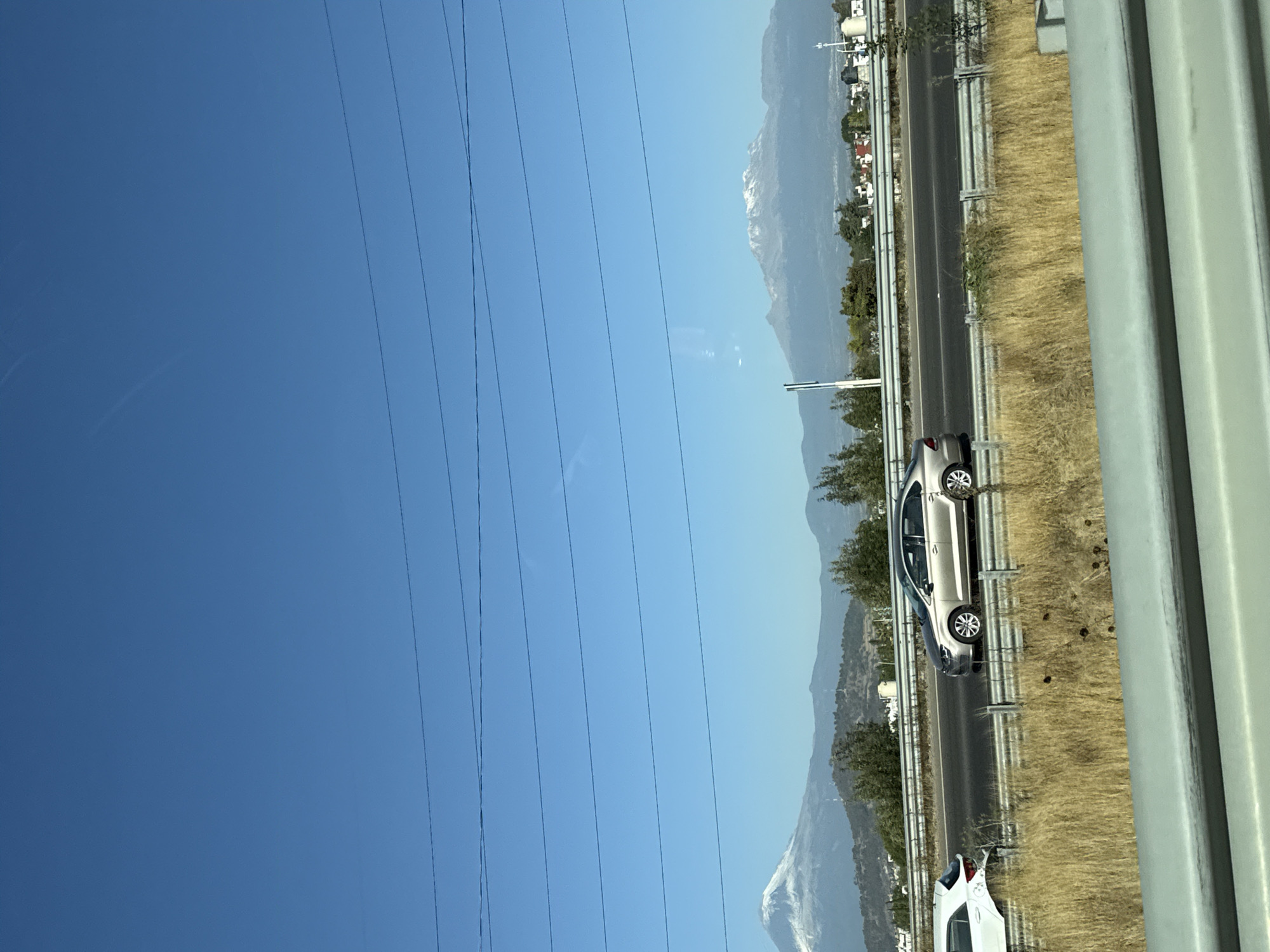 The image captures an outdoor scene on a clear, sunny day, overlooking a multi-lane highway in the vicinity of San Pedro Cholula, Mexico. In the immediate foreground, a light-colored, metallic guardrail extends horizontally across the bottom of the frame. Behind this, a strip of dry, golden-brown grass and vegetation separates the viewer's position from the highway. The mid-ground features an asphalt highway with at least two lanes of traffic traveling in the same direction, divided from opposing traffic by a metallic guardrail system. A light-colored (tan or silver) four-door sedan is observed moving from right to left in the lane closest to the viewer. To the far left, the rear section of a white hatchback or small SUV is partially visible, also in motion and traveling in the same direction as the sedan. The background is dominated by a clear blue sky, traversed by multiple thin, dark utility lines. On the horizon, two prominent snow-capped mountains are visible: a conical peak on the left (consistent with Popocatépetl) and an elongated, broader peak on the right (consistent with Iztaccíhuatl). Between the highway and the distant mountains, rolling hills with sparse green vegetation, scattered trees, and some distant urban structures, including buildings and white tanks, are present. A vertical white pole structure is visible to the left of the rightmost mountain.