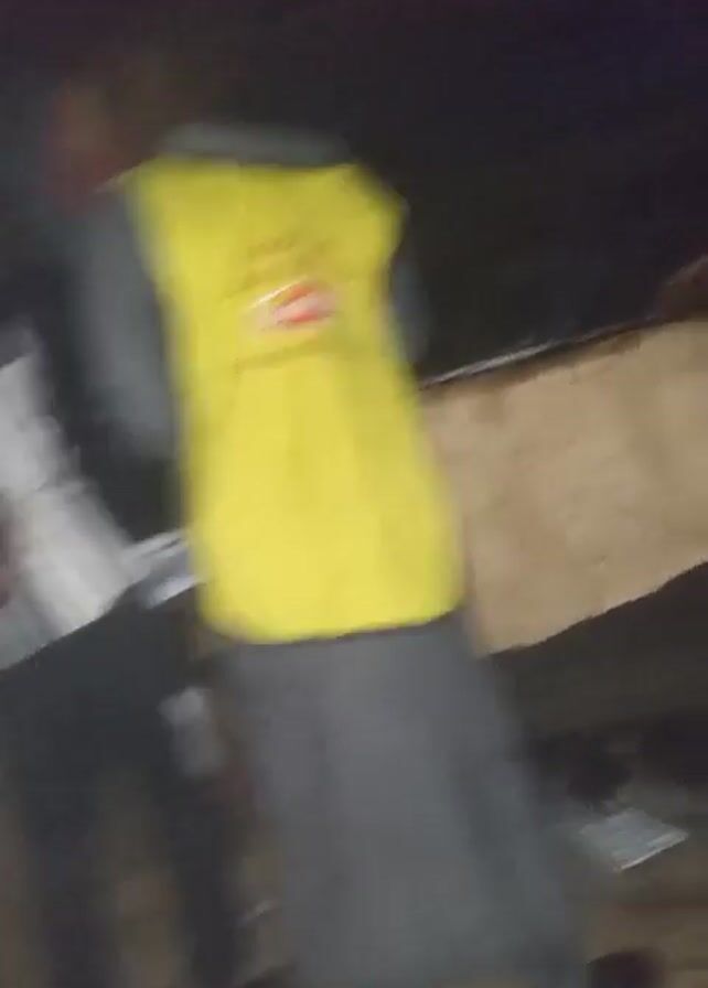 dimly lit, possibly enclosed, space with two people. One person wears a bright yellow vest with the Lipton logo and the words "ENJOY THE GREAT TASTE OF LIPTON EVERY MORNING". This person wears a gray top and a gray skirt or long shirt. The second person wears a vertically striped shirt, dark pants, and is partially cut off from view on the left of the frame. In the center of the video, there is a makeshift table covered with a dirty, light brown covering, possibly paper or cloth. A white plastic bucket is on the floor next to the table. The environment looks somewhat cluttered and unkempt.