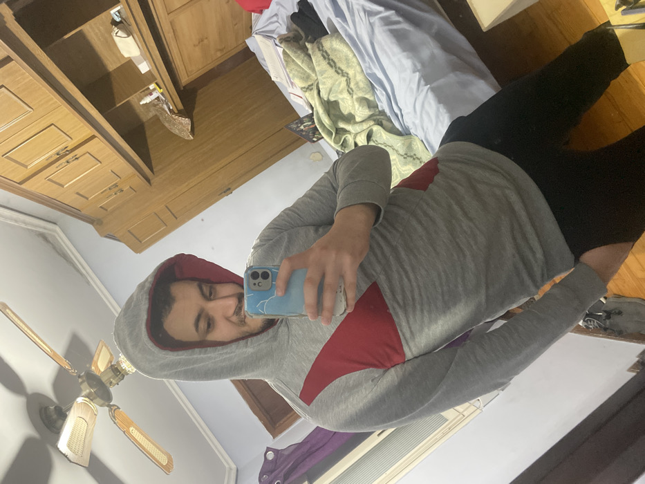 A man wearing a gray and red hoodie with black pants takes a selfie in a mirror