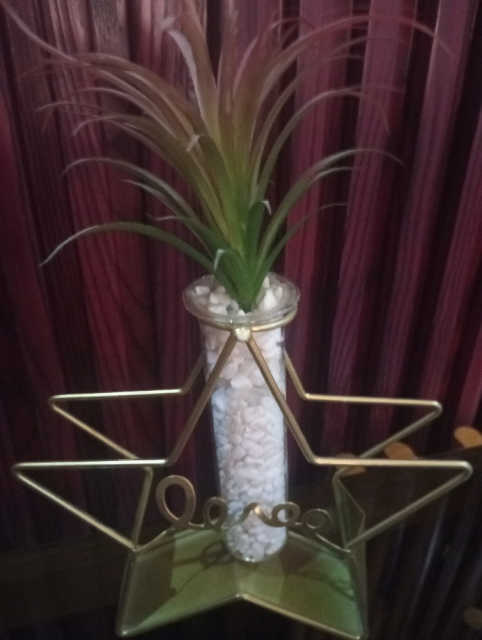 A faux air plant is arranged in a glass tube filled with small white stones. The tube rests within a gold-colored metal star-shaped stand featuring the word "Love" inscribed on its base. Background is a blurred burgundy curtain, adding depth to the image. The scene conveys a decorative, possibly romantic, aesthetic.