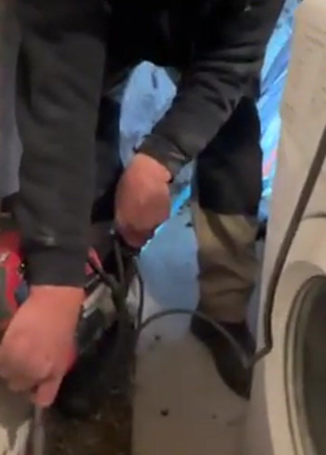 A man is shown using a red electric tool to cut something, possibly a pipe or conduit, inside a narrow space against a concrete wall. The man wears a black beanie, a black jacket or sweatshirt, and brown and black work pants. He also wears black shoes. The tool has a black cord, and a blue light illuminates the area where the cutting is taking place. The ground is concrete with some loose debris. The side of a white appliance, possibly a washing machine or dryer, is visible. The camera is positioned close to the man and the tool, providing a detailed view of the cutting process. The scene is relatively confined, and the lighting is a mix of natural and artificial light.