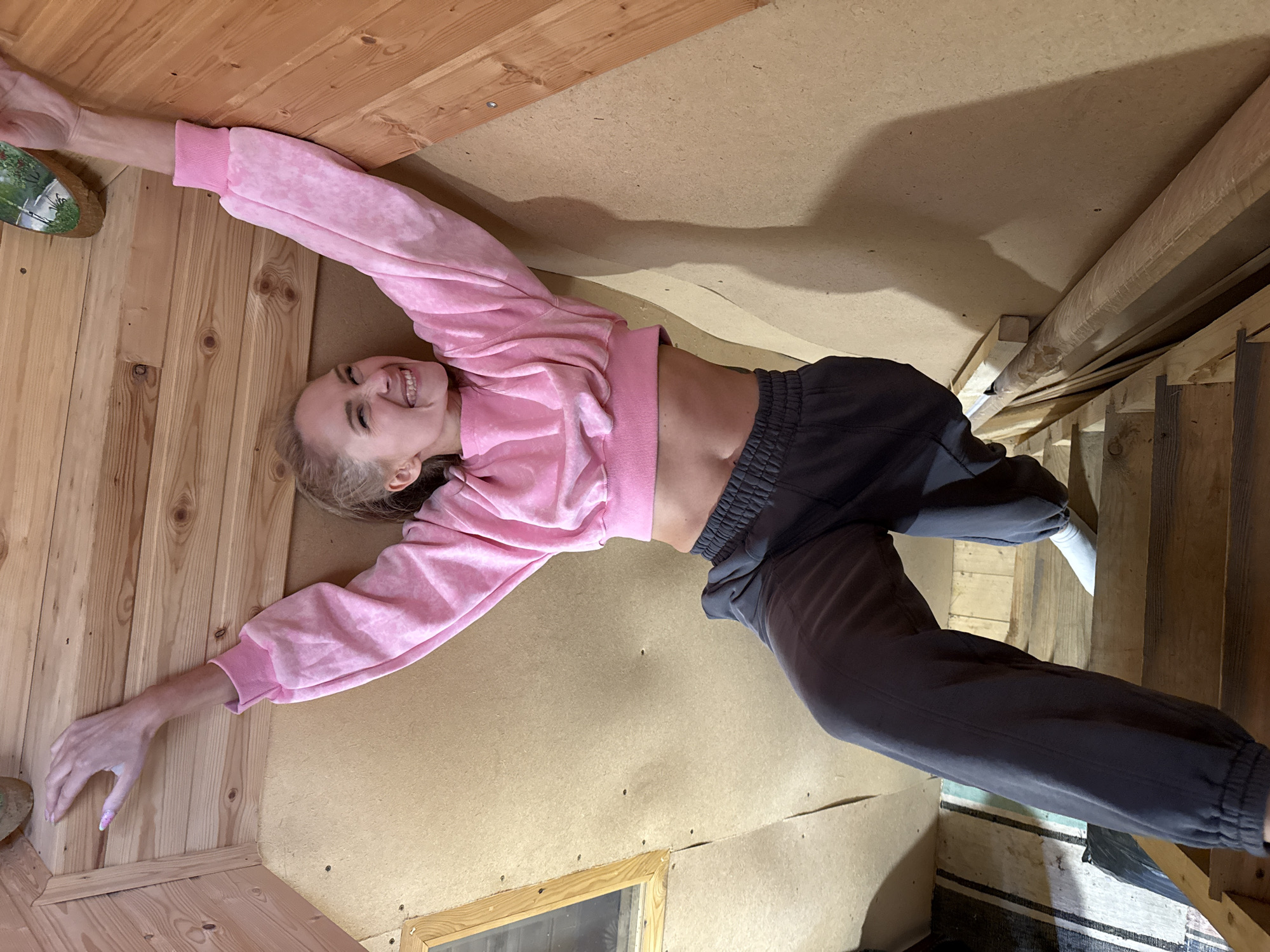 A young woman is lying on her side in what appears to be an attic or basement space. She is wearing a pink long-sleeved crop top and dark gray sweatpants with white socks. Her arms are outstretched, one towards a wood paneled wall and the other towards what looks like a painted object. The ceiling and floor are constructed of different materials; the ceiling is a light-colored particle board, while the floor consists of wooden planks. A staircase is visible on the right side of the frame. The image was likely taken in an interior setting, which could be in a city like Chaikovsky, Russia. However, without more information, the location cannot be confirmed.