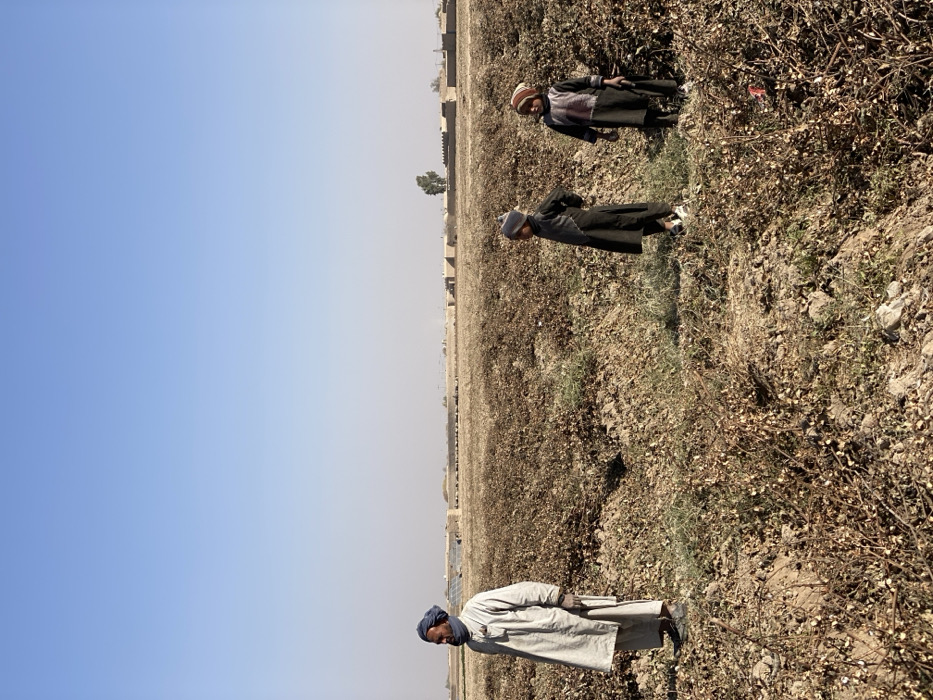 The image displays a dry, open field in Mandisar, Afghanistan, under a clear blue sky with a slight haze at the horizon. The field is composed of brown soil and contains numerous dessicated plant stalks, many retaining white fibrous material consistent with harvested cotton plants. On the left, an adult male stands facing slightly right, dressed in a light-colored tunic (perahan tunban), dark trousers, and a blue turban covering his head and part of his face. He holds a thin stick or cane in his right hand. Two children stand further into the field to his right. The child on the left is oriented in profile to the left, wearing dark clothing and a grey knitted beanie. The child on the right faces slightly left, also wearing dark clothing and a reddish-brown knitted beanie, with a dark object held in their left hand. In the background, a line of low, light-colored, rectangular buildings constructed from mud or brick extends across the landscape, with a single, slender tree visible among them. The ground features sparse green vegetation in patches. No active interactions are apparent among the individuals.