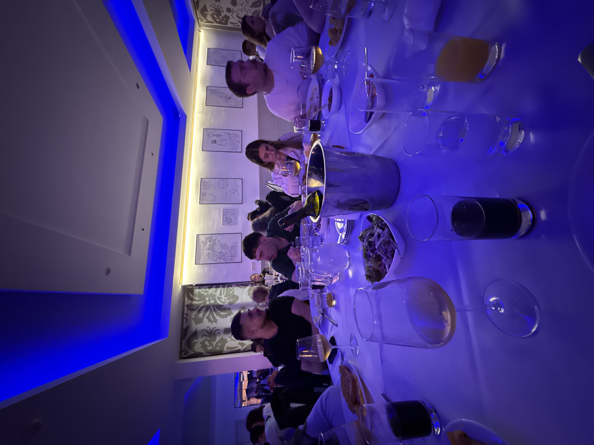 dimly lit restaurant interior with a long table set for a meal. Multiple people are seated around the table, appearing to be engaged in conversation and dining. A wine bucket is visible in the center of the table, along with numerous glasses, dishes with food, and cutlery. The interior design includes framed pictures on the wall and blue accent lighting. The location is Cukarica Urban Municipality, Serbia, based on the geographic coordinates.