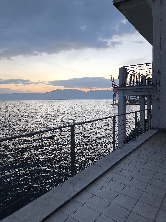 The image presents a panoramic view of the Grad Rijeka waterfront in Croatia during twilight. The scene is observed from a paved terrace or balcony, featuring light grey square tiles. A concrete ledge and a metal railing with horizontal bars separate the terrace from the water. To the immediate right, a light-colored concrete building structure exhibits an overhang and a vertical support pillar. A radial antenna is affixed to this pillar. Below the overhang, a lower balcony with a dark, decorative metal railing is partially visible. The midground is dominated by the Adriatic Sea, characterized by a rippled, dark surface reflecting the muted light. In the background, a low, dark mountain range silhouettes against a sky transitioning from pale orange and pink near the horizon to light blue and overcast grey overhead. On the far right, distinct red and white industrial cranes, indicative of a port, are visible over the water, accompanied by faint lights. No individuals or specific actions are depicted.